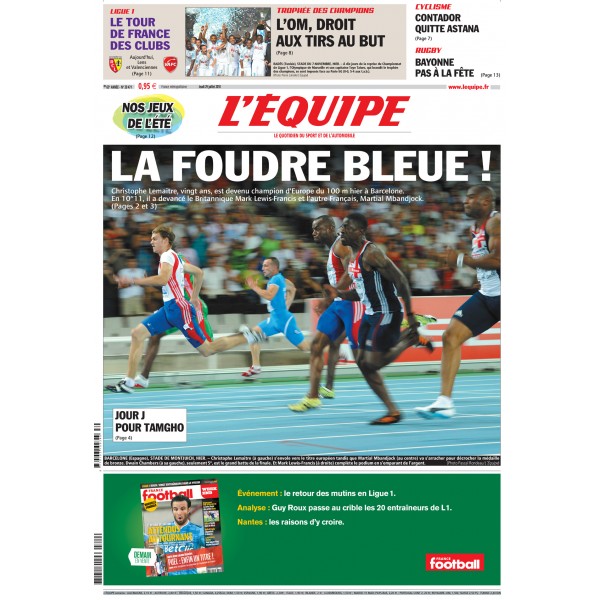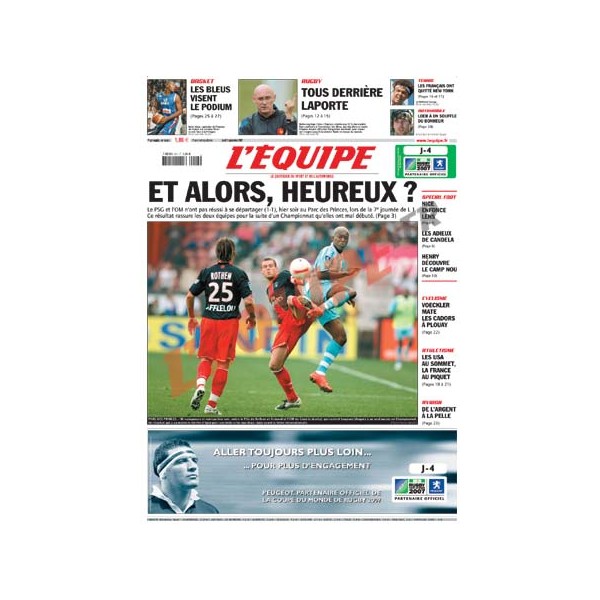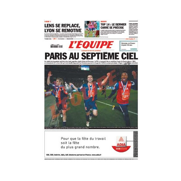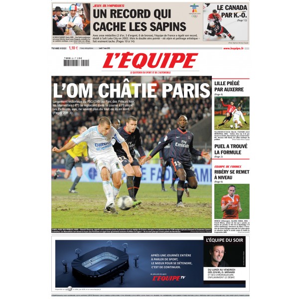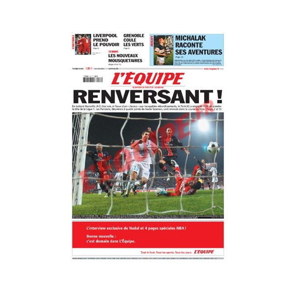 4-2. Score historique. En cas de victoire, les olympiens pouvaient chiper la première place aux lyonnais. Malheureusement pour eux, ils ont ce soir là affronté des parisiens morts de faim. Je m’en rappelle comme si c’était hier d’ailleurs… Je l’ai écouté à la radio, n’ayant pas canal sur mon lieu de vacances et la une de l’Equipe (voir photo) est encore précisément conservée dans mes placards. Enfin bref, Hoarau par deux fois (10ème, 83ème), Luyindula (53ème) ainsi que Rothen sur coup-franc (77ème) sont venus à bout des marseillais qui ont pourtant mené au score grâce aux réalisation de Niang (19ème) et Valbuena (45ème). Un vrai plaisir.