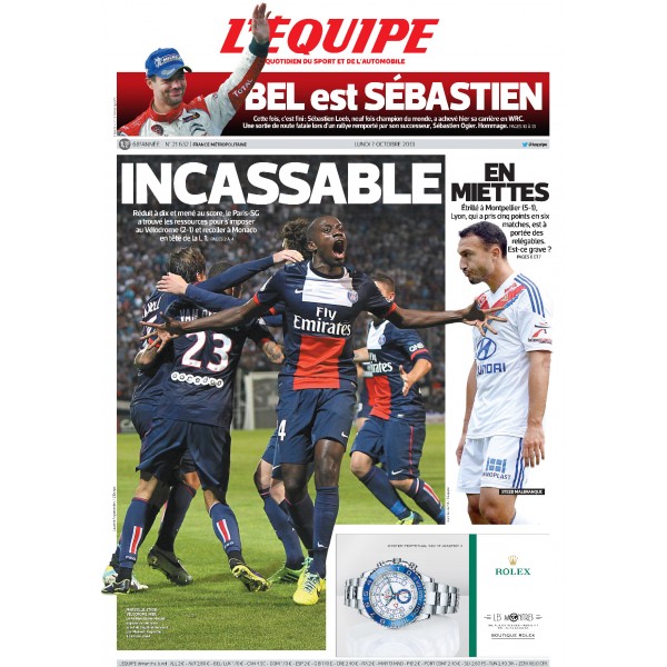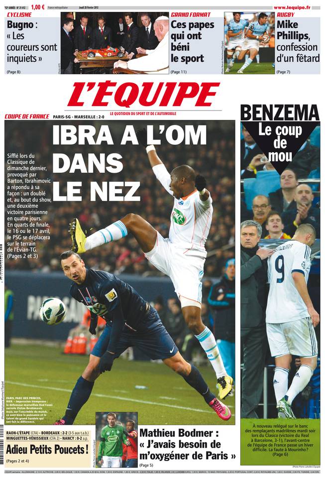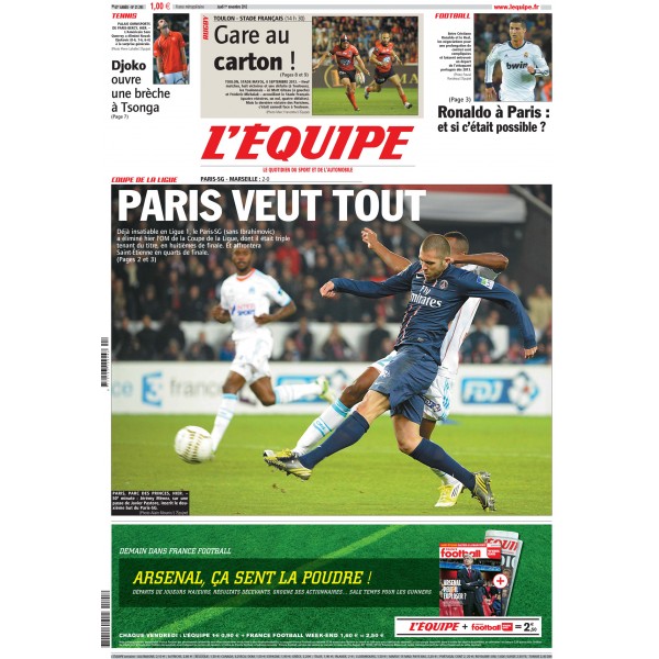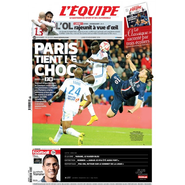 Carlo Ancelotti avait décidé de faire tourner son effectif et son pari s’est montré gagnant. Le Paris SG s’est ainsi qualifié pour les quarts de finale de la Coupe de la Ligue en dominant Marseille (2-0), éliminant ainsi le triple tenant qui a joué une heure à dix. Heureux d’avoir réussi à voir le match depuis la République Tchèque, j’avais surtout été séduit par la maitrise collective qui avait tant fait défaut au club parisien jusqu’à lors. Même si le penalty et l’exclusion de Fanni semblent un peu sévère, je pense que Paris, qui jouait sans Ibra, méritait sa victoire. La une de l’Equipe le lendemain (voir photo) est tout de même assez trompeuse, puisqu’un mois après, les parisiens se feront sortir aux tirs aux buts par Saint-Etienne. (Re-découvrez le résumé de ce match en cliquant ici).