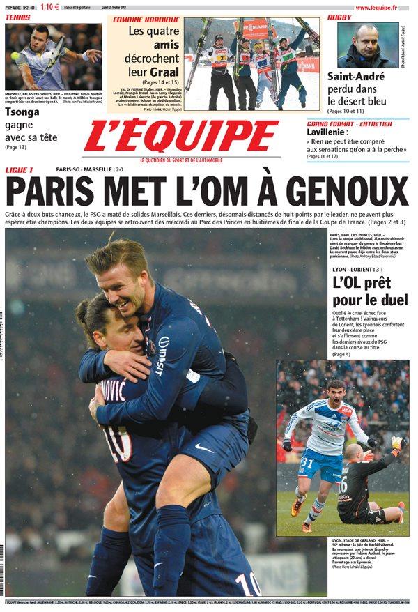 Le Paris Saint-Germain s’est imposé sur la pelouse de Parc des princes face à l’Olympique de Marseille 2-0 dimanche soir. Malgré ce score, les parisiens ont été dominés par des marseillais joueurs et solidaires mais, qui par manque de réussite, n’ont pu espérer un autre résultat. A l’inverse, les hommes de Carlo Ancelotti ont trouvé la faille par Nicolas N’Koulou (Contre son camps), puis par le géant Zlatan Ibrahimovic à la dernière minute du match. Grâce à cette victoire poussive, le PSG conservait plus que jamais sa place de leader. Beckham aura par-ailleurs disputé ses premières minutes dans notre championnat, en entrant en jeu à 15 minutes du terme. Etonnant. (Re-découvrez le résumé de ce match en cliquant ici).