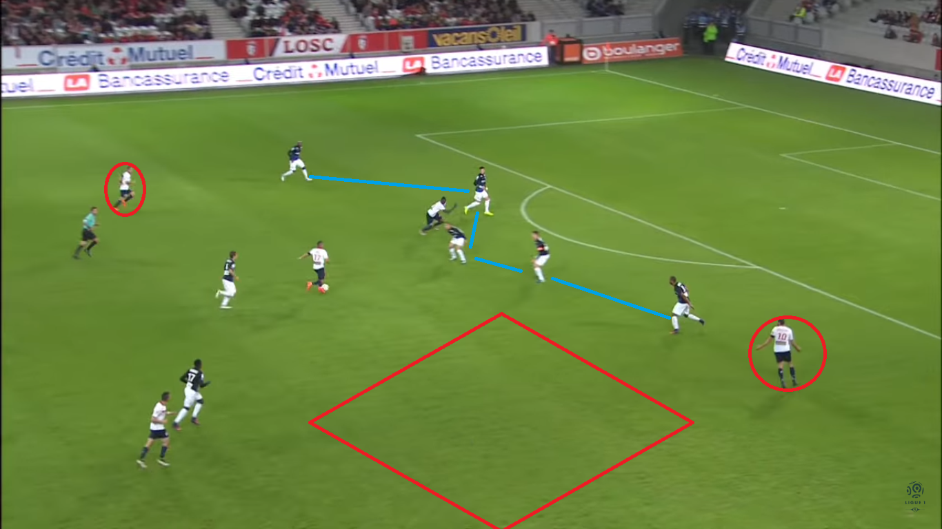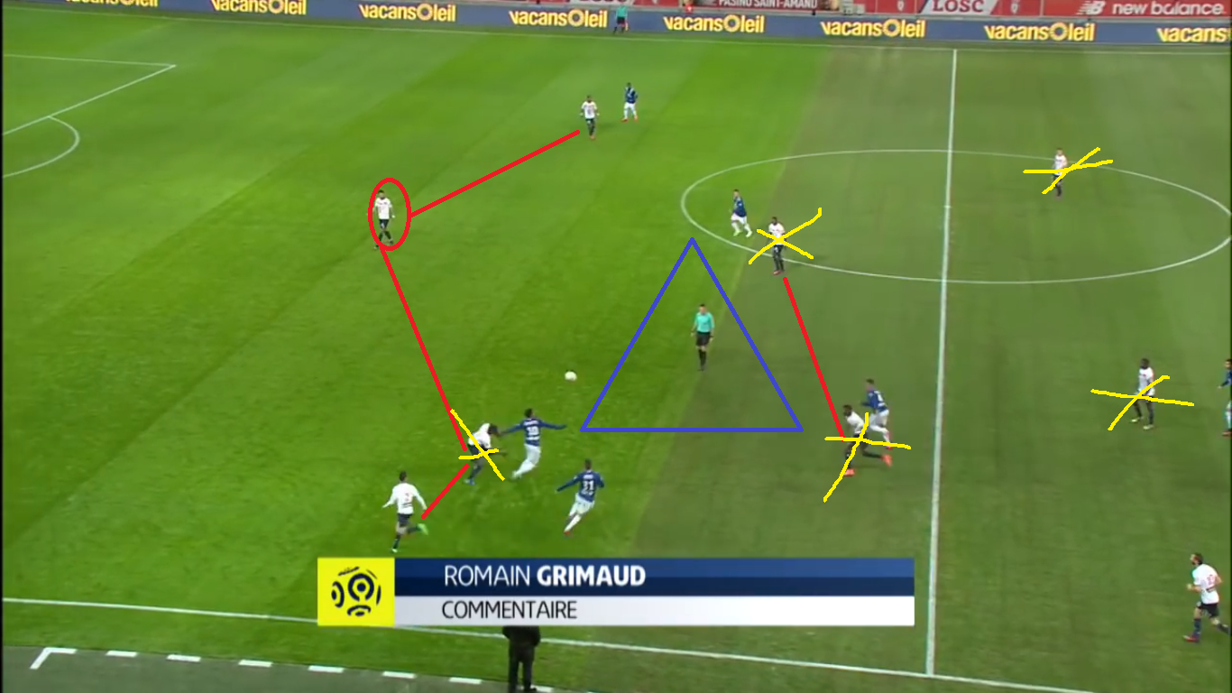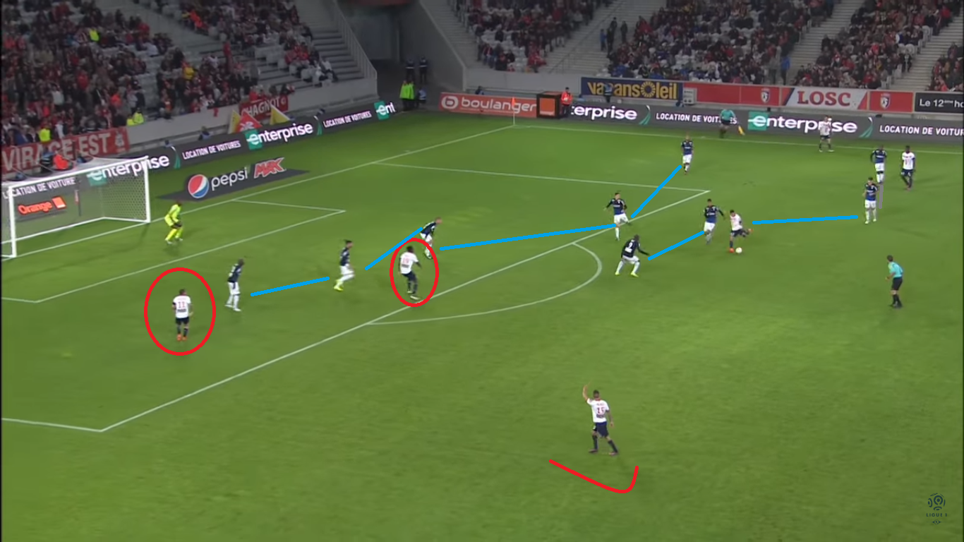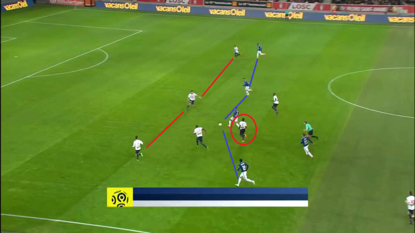 Dès le départ de l’action, la défense a 4 lillois est complètement désorganisée, à l’image de Marko Basa, hors-sujet et déconnecté de l’action, distancé d’une dizaine de mètres par ses compères de défense. De fait, Soumaoro se retrouve seul au duel face à Lacazette, perd son duel, pendant que Amadou et Sankharé abandonnent complètement les joueurs autour d’eux au marquage.