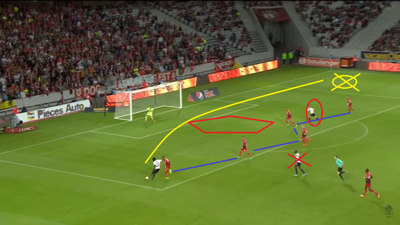 Car il y a également une double conséquence à la faiblesse des relayeurs du LOSC : Eder se retrouve presque constamment excentré (la plupart du temps à droite) laissant l’axe désespérément vide. Mais nous aurons l’occasion d’y revenir plus bas.
