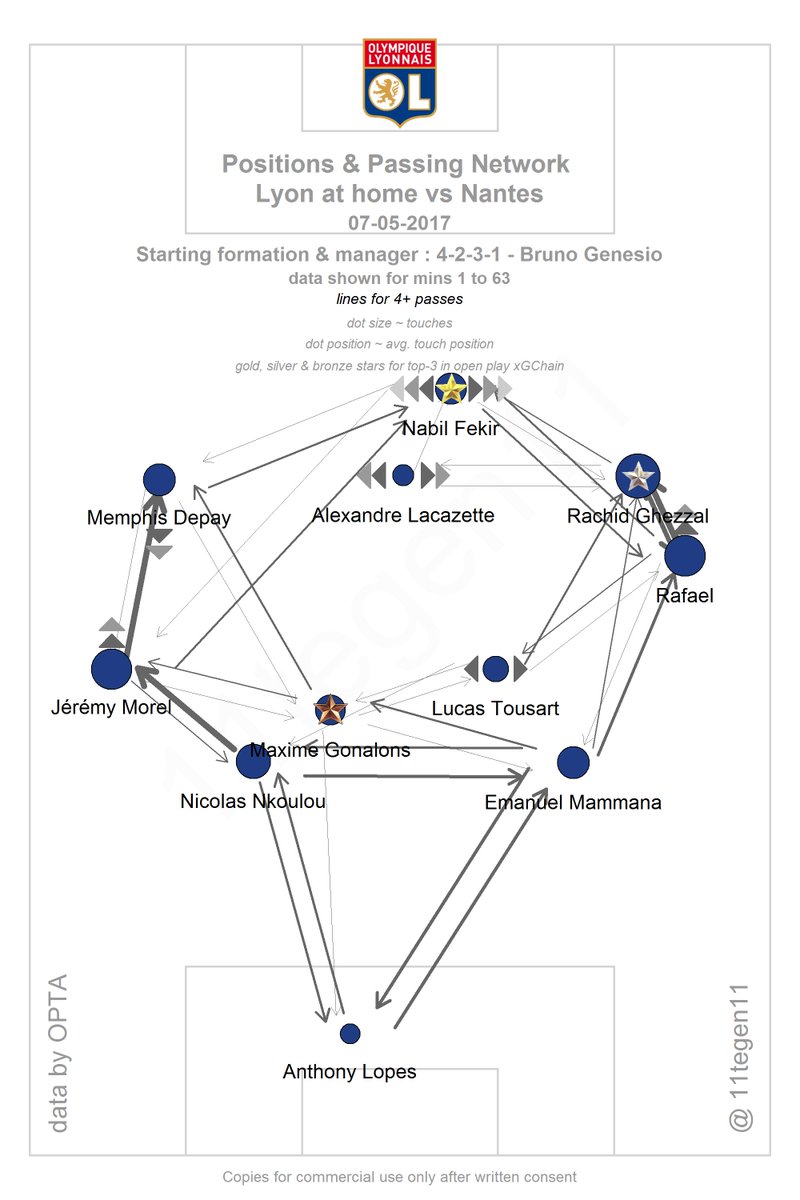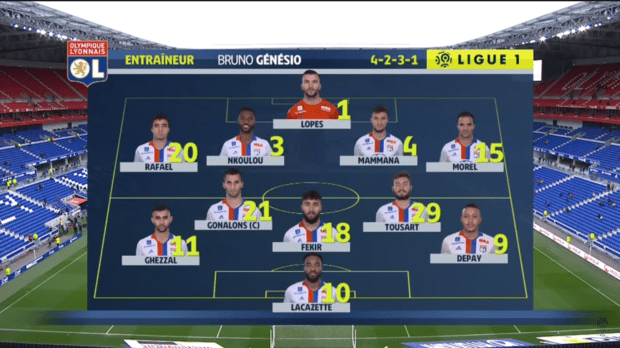 Contre Nantes, dimanche, rencontre qui me servira plus ou moins de fil conducteur pour cette analyse, Genesio avait une fois de plus choisi d’aligner un 4-2-3-1 avec deux milieux récupérateurs dans le rôle de pivot (!) et un numéro 10, qui en fait a joué 9 ou 9,5 pendant la quasi intégralité du match. La présence de Ghezzal, régulier dans sa médiocrité, a une nouvelle fois de quoi surprendre. Fékir, Depay et Lacazette, quant à eux, démarraient ensemble pour la première fois le nul à Bordeaux début mars…