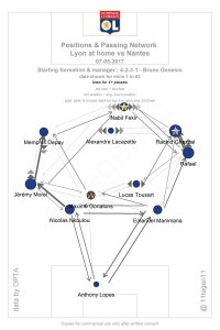 Premier exemple, contre Nantes. La première chose qui frappe face à un tel schéma tactique, est le déséquilibre complet et total du 11 lyonnais. Certains joueurs qui devraient être omniprésents et au coeur du jeu, comme Tousart et Gonalons font partie des joueurs ayant fait le moins de passes ! Et encore, le peu de passes effectuées (et réussies, la précision est importante) par ce duo sont destinées aux latéraux. A noter que le passing de Gonalons est aussi mauvais à chaque match. Lacazette, diminué par sa blessure, est étrangement seul, et a peiné à exister au coeur du jeu. Critique du système, critique des hommes.