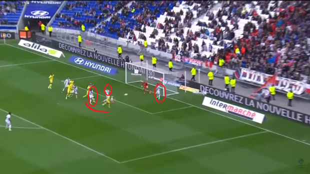 Deuxième faiblesse lyonnaise illustrée sur le second but nantais, les coups de pieds arrêtés. 1/3 des buts lyonnais sont encaissés sur des phases arrêtées ! Et Lopes reste sur 6 matchs en championnat en encaissant au moins un but sur ces phases de jeu. Incompréhensible.