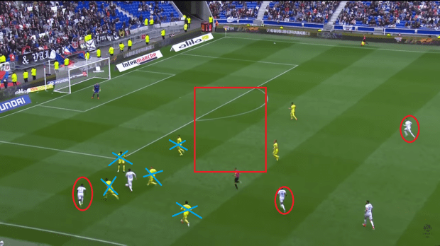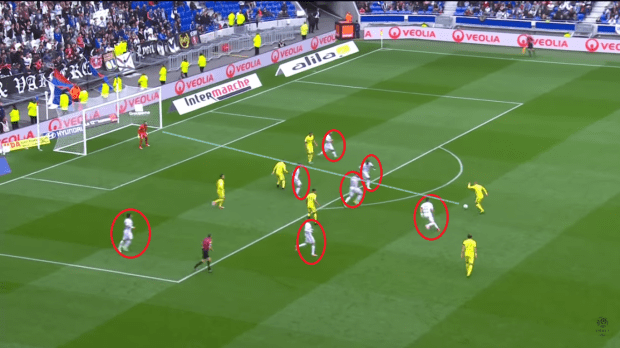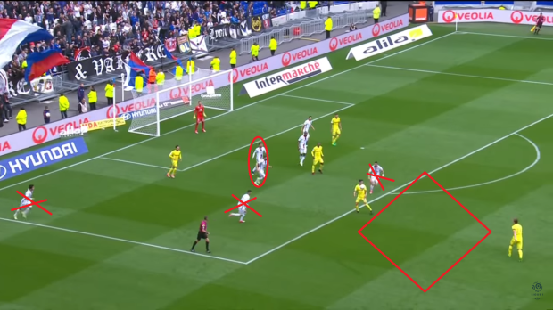 Autre critique du 4-2-3-1, Fekir ne joue pas 10, mais davantage 9,5, presque 9. Son positionnement sur le terrain en témoigne, ce qui isole encore davantage les deux milieux derrière lui.